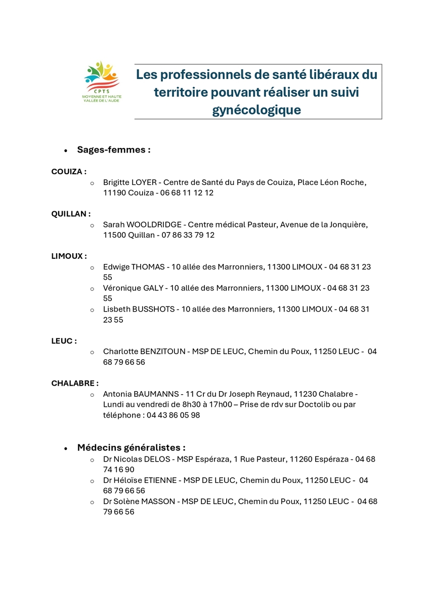 Les professionnels de santé libéraux du territoire pouvant réaliser un suivi gynécologique