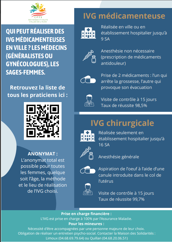 La CPTS Moyenne et Haute Vallée de l'Aude s'engage pour faciliter l'accès à l'interruption volontaire de grossesse (IVG) sur notre territoire. Dans le cadre de notre mission "Parcours femme et petite enfance", nous souhaitons vous informer sur les professionnels de santé disponibles et les différentes options qui s'offrent à vous.